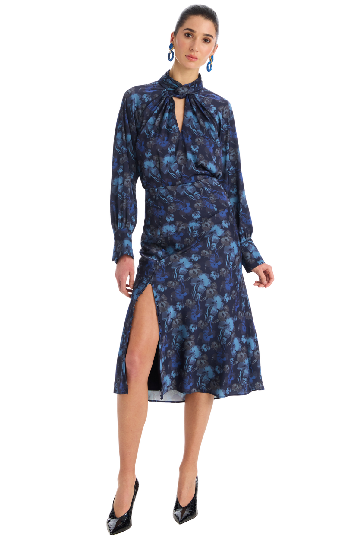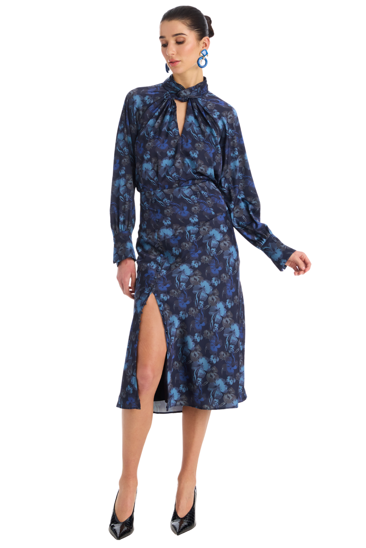 Take the Samantha Blouse from desk to date this season. Cut in a classic Midnight Floral Print on a silky soft satin fabrication. The high neck features a twist detail leading to a front keyhole opening. Features a billowing sleeve ending in a buttoned cuff. Loose fit throughout the body with a back button closure at the neck. Pair back to the Reese Skirt for a matching set.