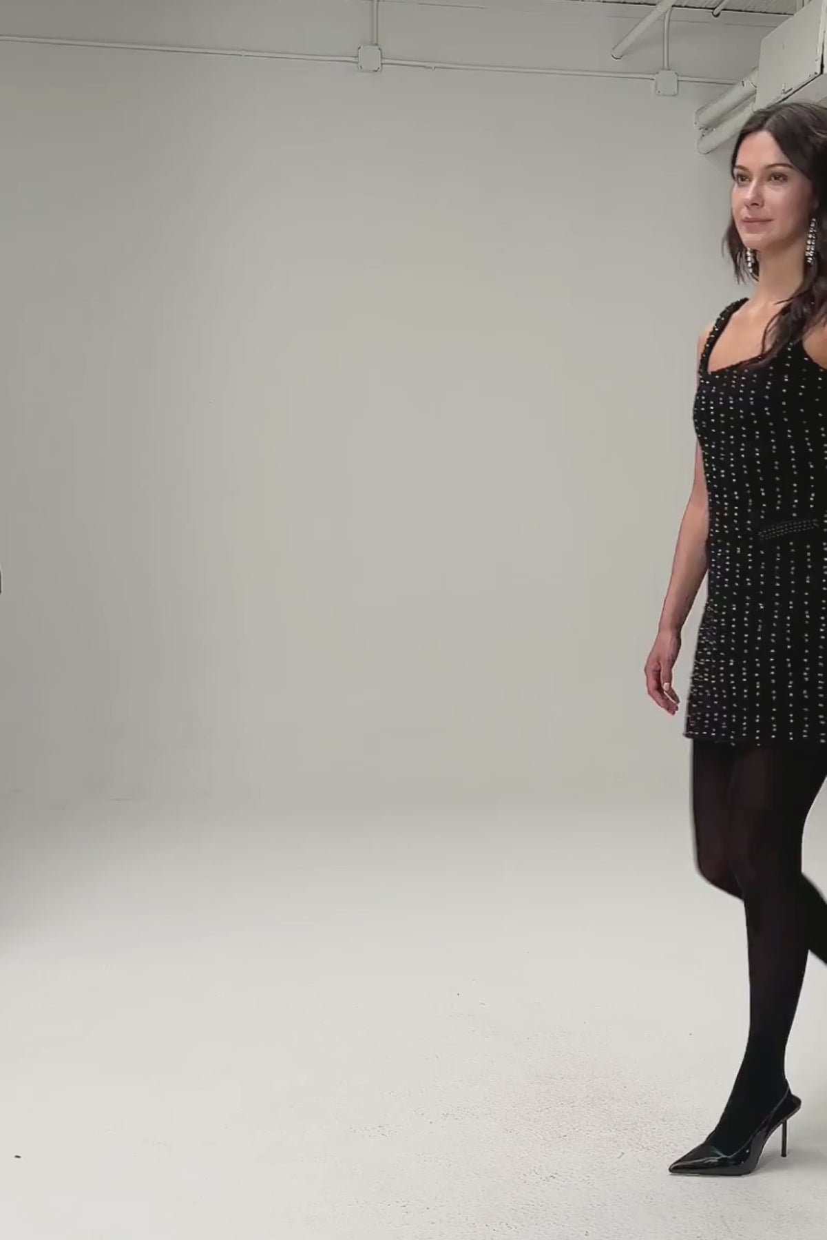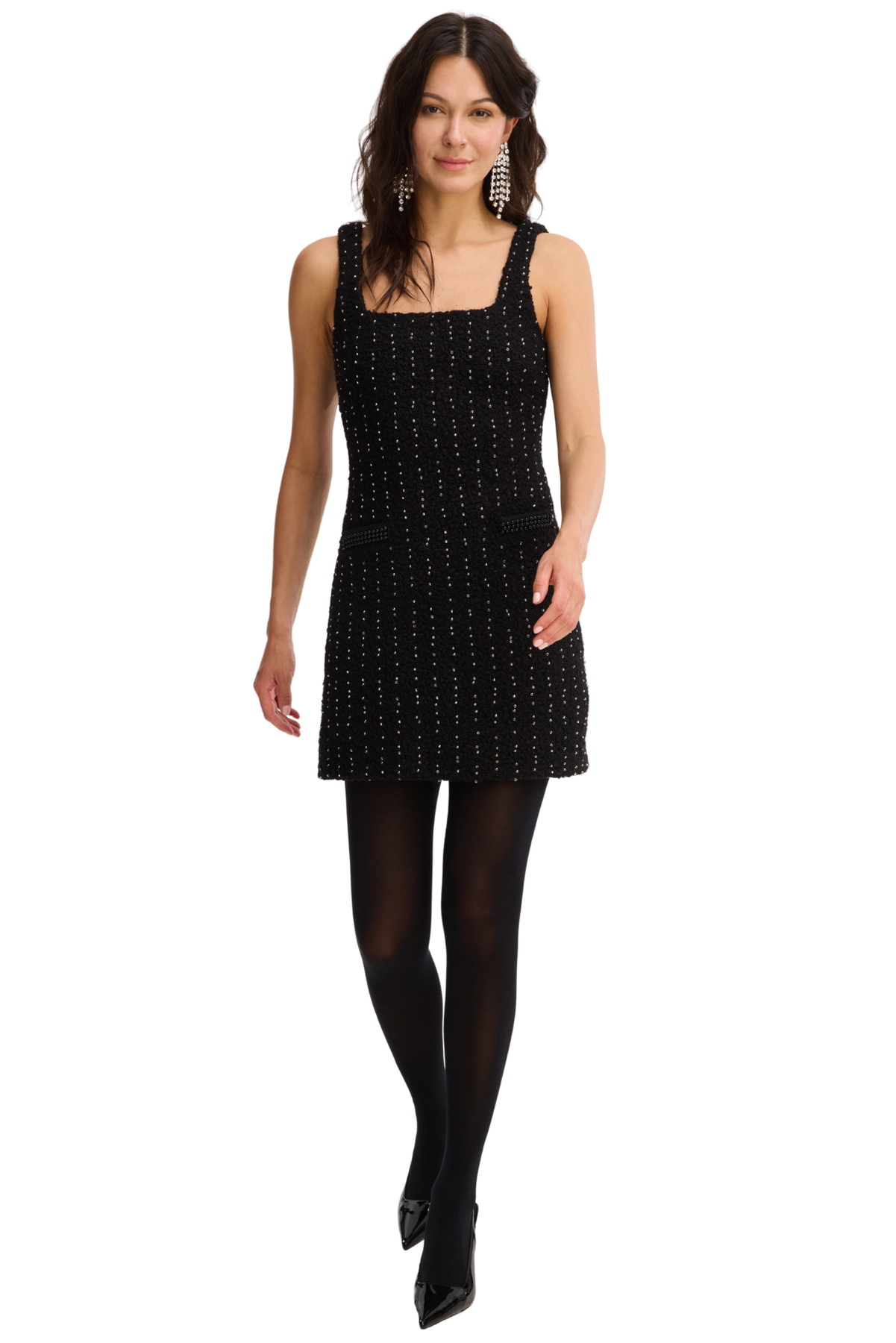 - Fit: Fully beaded on a boucle fabrication making this the ultimate winter party dress. The square neckline leads to a bra-friendly strap and a fitted style through the body. Darts at the bust and body offer shaping to this sleek and sophisticated dress.