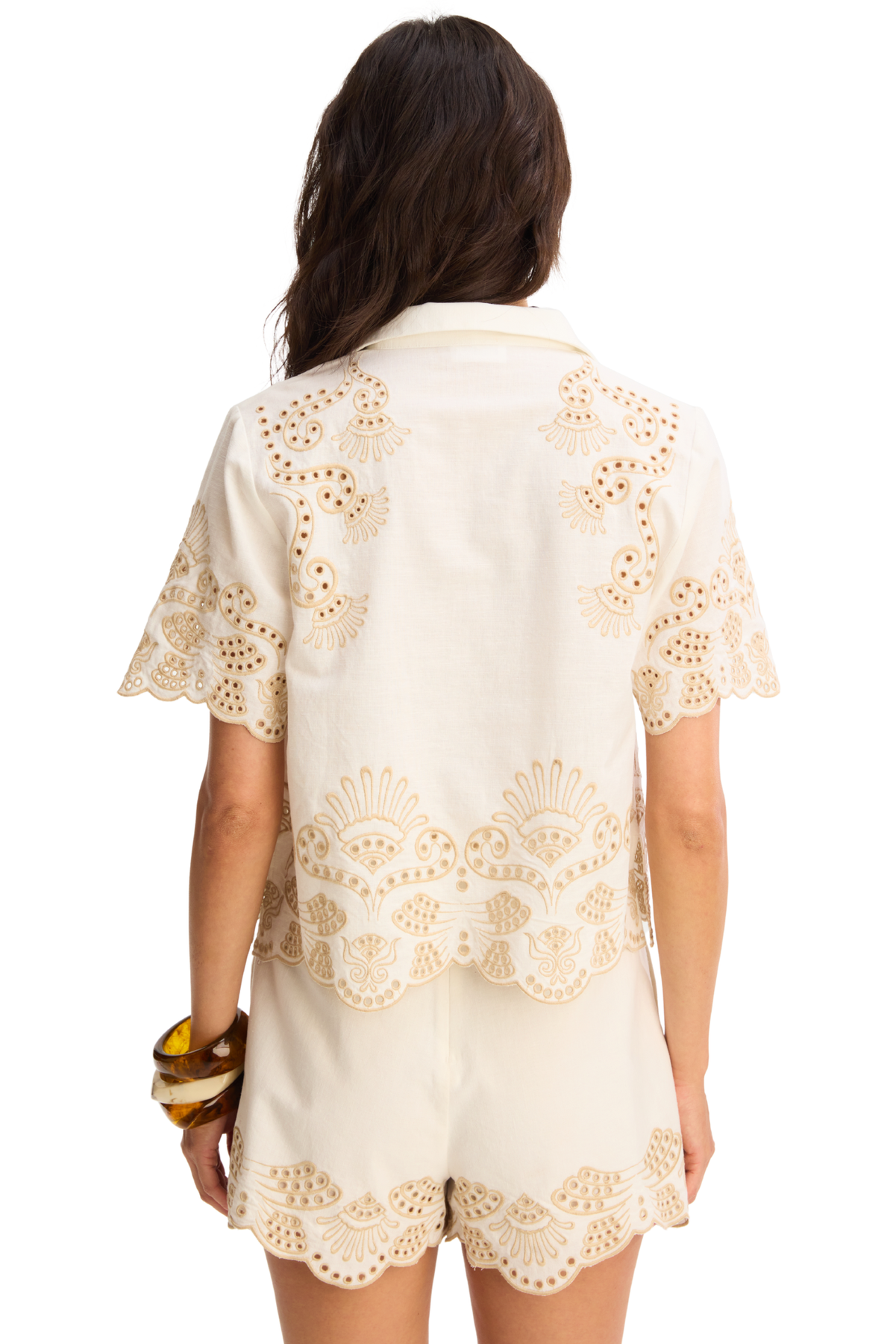 - Fit: A take on last season's Rowen Top with a split V neckline. Boxy fit and slightly cropped. Unlined. Adorned with tonal embroidery and eyeleting.