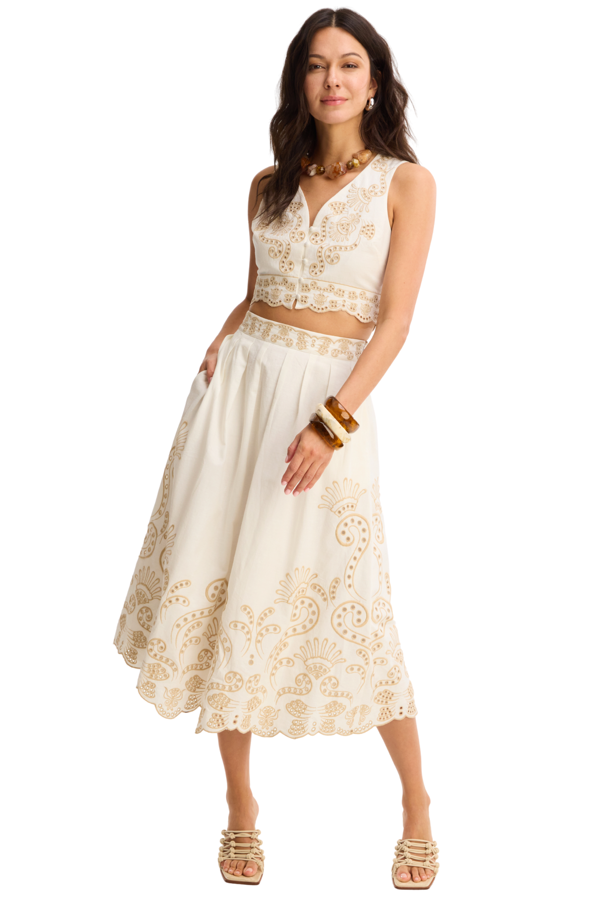 - Fit: An update to Spring's best selling Vest in classic tonal colors and a large scale eyelet motif. Cropped in length and fitted through the bust with darts for shaping. Front button closure and a scalloped hem. Fully lined.