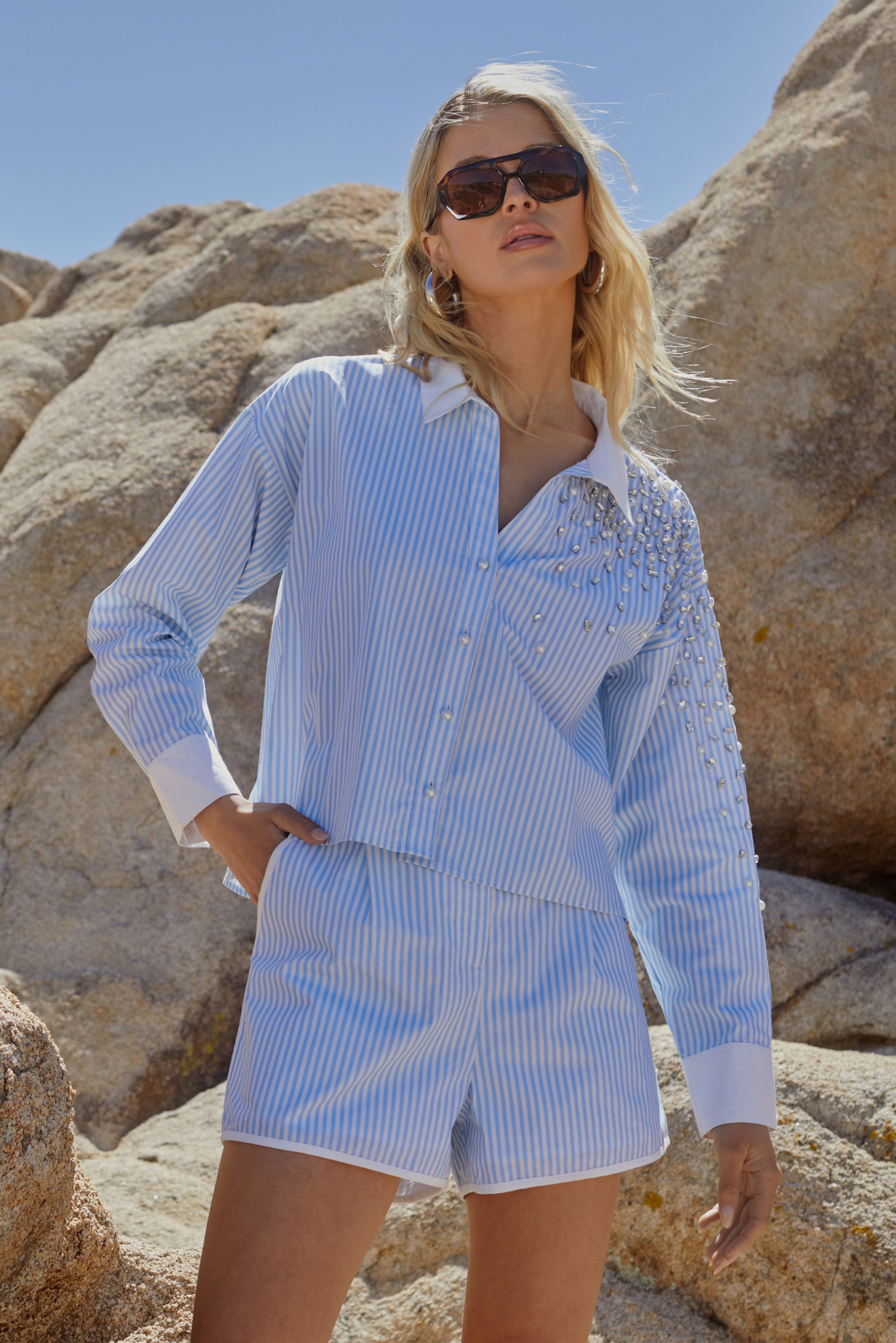 - Fit: The Rhinestone Emily Top is a stand out item with hand sewn rhinestones and pearls along the top shoulder and sleeve. Designed with a slightly cropped and boxy fit. Cut in a crisp cotton poplin with contrasting collar and cuffs.