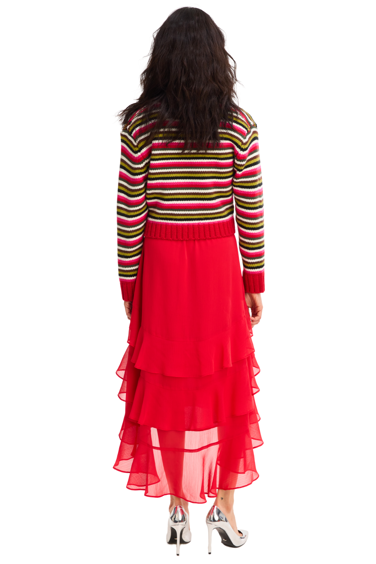 - Fit: Hand knit Cardigan with self ties at the center front. Features bold stripes and a slightly boxy fit.