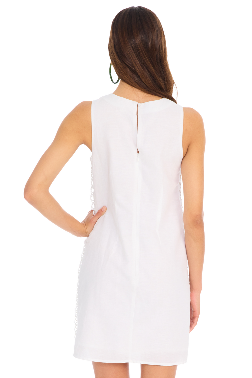 Simple with a twist: The Aimee Dress is a summer staple designed in a sleek straight shape with a basket-weave detail down the sides. Cut with a scoop neckline and darting at the bust and body for slight shaping. Back buttoned keyhole and zipper closure and fully lined.
