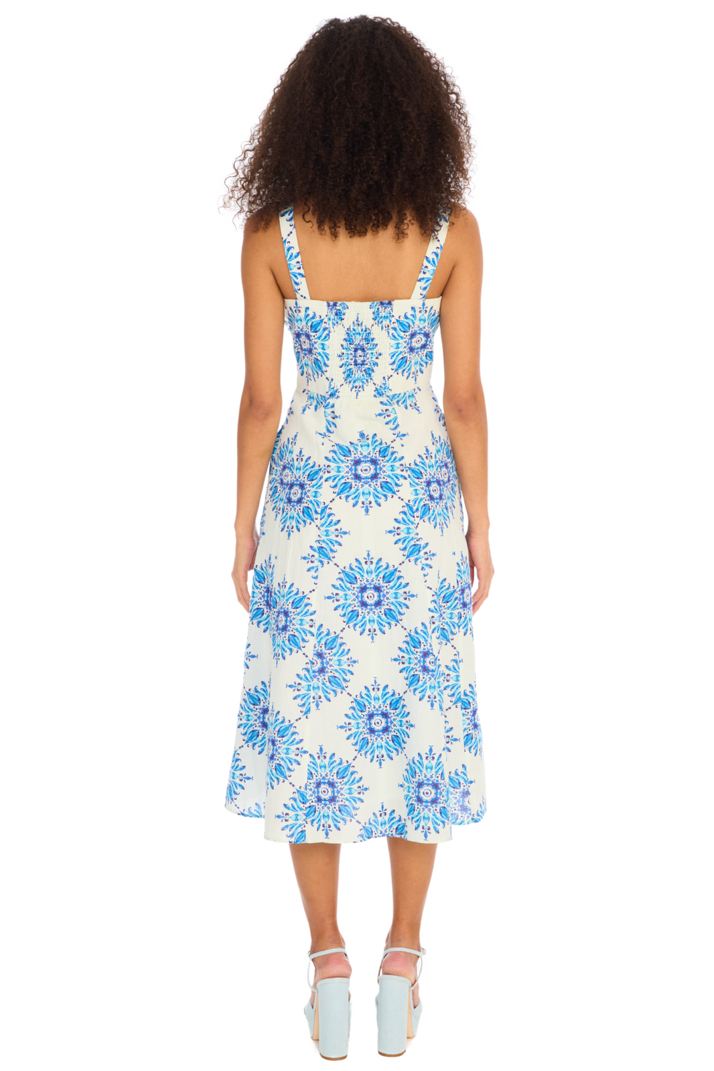 Transport yourself to an island in Greece. The Bella Dress is a timeless silhouette cut in a cotton/linen fabrication. Designed with a squared neckline with a split V shape and adjustable straps. The fitted bodice offers structure along with a smocked back for added comfort. Features princess seams along the front and back and center front covered buttons. Each dress is carefully cut to ensure the perfect print placement. Fully lined.